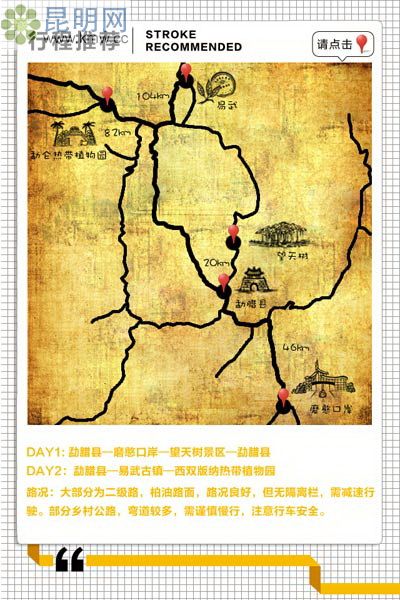 DAY1:勐臘縣—磨憨口岸(46公里,1小時(shí))—望天樹(shù)景區(qū)(64公里,1.5小時(shí))—勐臘縣(20公里,40分鐘)