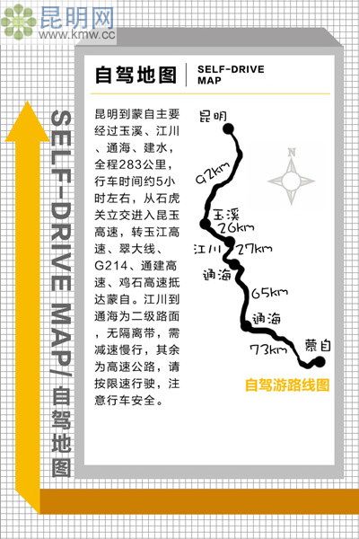 昆明到蒙自主要經過玉溪、江川、通海、建水,全程283公里,行車時間約5小時左右,從石虎關立交進入昆玉高速,轉玉江高速、翠大線、G214、通建高速、雞石高速抵達蒙自。江川到通海為二級路面,無隔離帶,需減速慢行,其余為高速公路,請按限速行駛,注意行車安全。