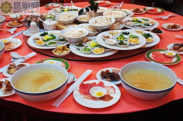 涼拌雞、扣雞、扣肉、蹄花青筍、生爆油炸肉、扣蛋卷、粉蒸肉、三絲炒面,每一個大海碗里,除了上面蓋滿的肉類之外,下面還藏了各種蔬菜,八個葷菜下面就是八個蔬菜,可謂是葷素搭配合理的健康菜。這些普通的菜肴做成功夫菜肴之后,就成為耙、爛、淡、燙的紅河名菜。這種菜特別適合老人群體享用,故也可以稱為敬老菜。