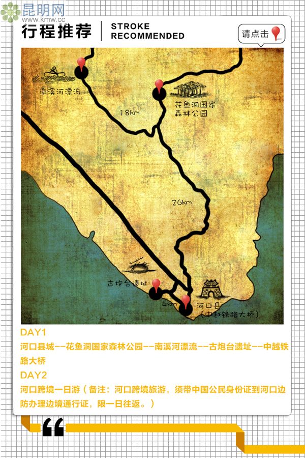 備注:河口跨境旅游,須帶中國公民身份證到河口邊防辦理邊境通行證,限一日往返。