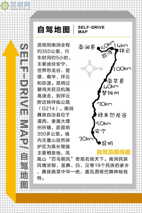 南澗縣城-40km-鳳凰山(鳳凰山茶場、萬畝生態茶園)-42km-小灣東鎮-10km小灣風光(庫區大壩)
