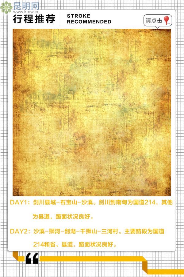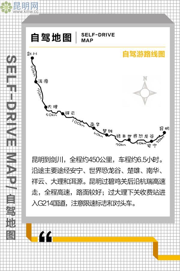 劍川縣城-21km-石寶山-15km-沙溪。劍川到南甸為國(guó)道214,其他為縣道,路面狀況良好。