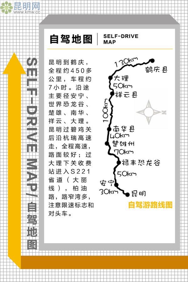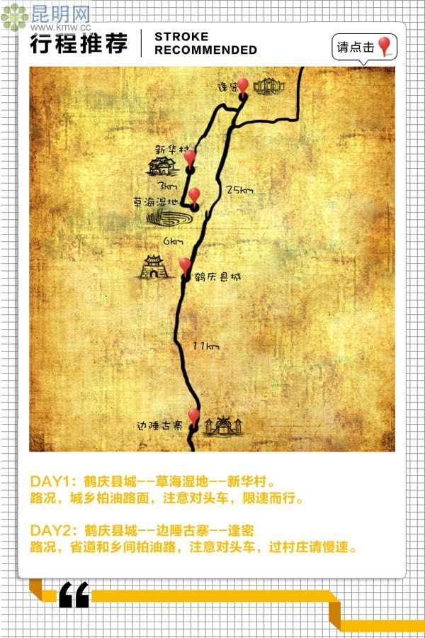 鶴慶縣城-11km-邊陲古寨-25km-逢密(大龍?zhí)叮钭邳S故居)。路況,省道和鄉(xiāng)間柏油路,注意對頭車,過村莊請慢速。