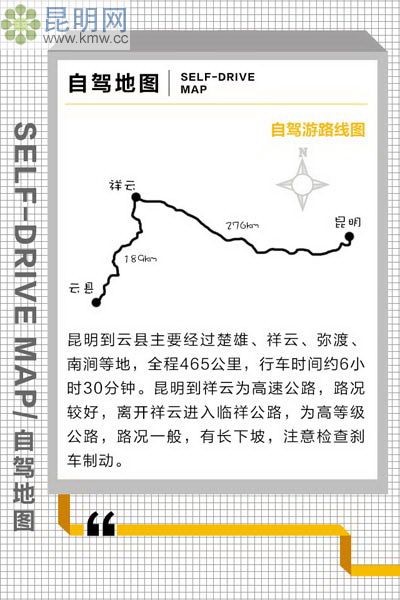 昆明到云縣主要經過楚雄、祥云、彌渡、南澗等地,全程465公里,行車時間約6小時30分鐘。昆明到祥云為高速公路,路況較好,離開祥云進入臨祥公路,為高等級公路,路況一般,有長下坡,注意檢查剎車制動。