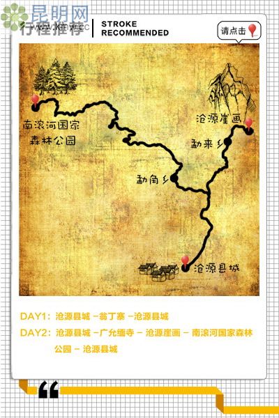 位于縣城以北勐來鄉約20km范圍內。1號崖畫位于勐來鄉崖畫寨,距離縣城20km,可駕車直達。秀美自然風光結合粗狂浩方崖畫。一路上有溶洞景點(門票26元)、佤族民族村(門票15元)和崖畫(15元),就餐可在農家樂,住宿需回縣城。
