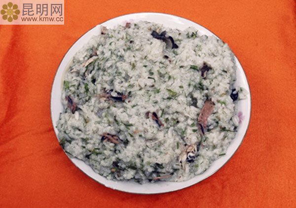 即佤族最講究的雞肉爛飯。多數情況下作菜肴。據佤族文化,待客不用白羽毛雞,因為意味著對客人不禮貌。