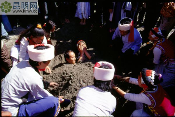 傈僳族古老習俗,意味著埋去死神,迎來永恒的愛情和吉祥。這種活動參與性強,游客在此觀看,一不留神,就會被當成傈僳族的”情人“埋進沙灘里。