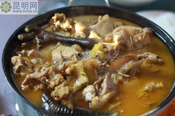 怒族的主飯食之一。大粒包谷砂用來煮稀飯,在鐵鍋或土鍋內一次放足水,用柴禾煮到2小時左右,待煮熟后再放上蔬菜之類,備些豆豉或辣子,吃起來味美香甜,開胃又解渴。