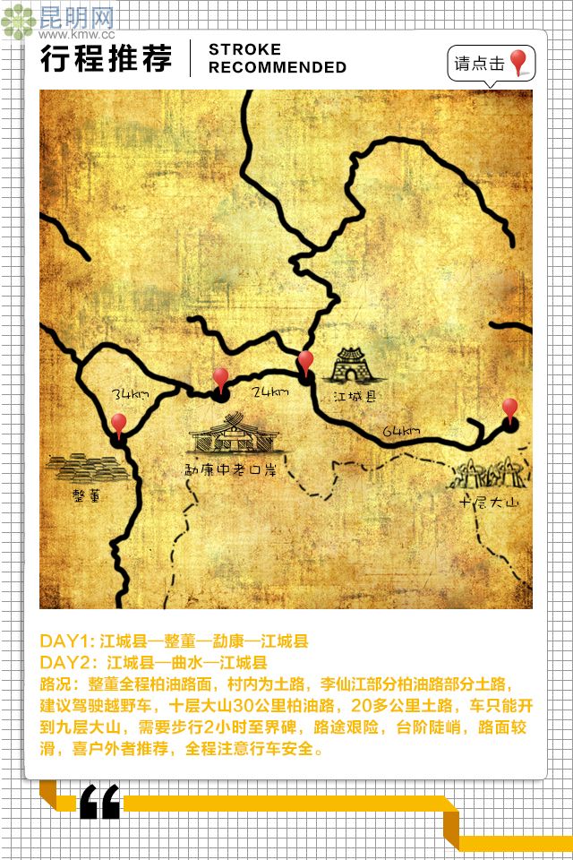 DAY1: 江城縣—整董(56公里,1.5小時(shí))—勐康(34公里,1小時(shí))—江城縣(24公里,40分鐘)