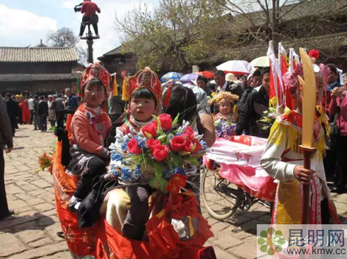二月初八日,劍川古城打掃得干干凈凈,家家門前豎起1米多高香,等待“太子”的到來。正午時分,當(dāng)年剛結(jié)過婚的小伙子們,穿上民族盛裝,爭先恐后,用八抬大轎將“太子”從行宮里扛出來,人們穿紅著綠,有的捧著佛前供品,有的扛著花樣旗幡,前呼后擁陪伴太子同游東、南、西、北門,隊伍中一隊裝扮得十分艷麗的童男童女,背著大紅印,有的由家人扶著騎上大紅馬,有的由家人推著坐上輪車隨同太子游四門,游行的隊伍在民間獅隊、龍隊、舞隊的引領(lǐng)下,邊舞邊行,浩浩蕩蕩沿街巷穿行。太子游四門時,當(dāng)?shù)丶壹覒魬舴傧愎Ш颍蔚礁骷议T口, 放鞭炮、 捐化錢幣,以求添財進福,萬事如意。除將太子八抬大轎抬至四門出游外,還安置一座花山,將一尊空心小太子置于上方,并置水缸于一側(cè),用水壓使太子“撒尿” ,民間有用“太子尿”洗眼可治眼疾的習(xí)俗。
