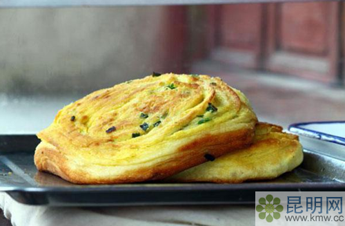 大理喜洲粑粑又名破酥,是一種色、香、味俱佳的面麥燒餅。面粉加適量的堿揉透,再加精油分層,撒上蔥花、花椒、食鹽為咸味;加火腿、肉丁、油渣、紅糖包心為甜味。放在圓形砧板上,再用油刷在餅子朝上的一面刷上一層香油,然后放入鍋中烘烤。烤出來的喜洲粑粑不僅色美味香,而且廉價實惠。