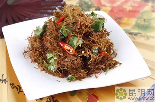 此青蛙皮非彼青蛙皮,只是一種看起來很像青蛙皮的植物。這種云南原始森林喬木中的苔蘚類植被,由于長相酷似青蛙皮,又像蝴蝶翅膀的脈絡,故云南人稱“青蛙皮”、“樹蝴蝶”。乍看起來是一大盤青蛙皮狀的東西,上面是翠綠色的花紋,吃起來又酸又辣,第一次品嘗的人可能有點不習慣,但它的口感非常特別,是一種非常舒展的香脆,有股很特別的香,嚼得越久,香味越持久。是白族人喜愛的一道天然綠色食品。
