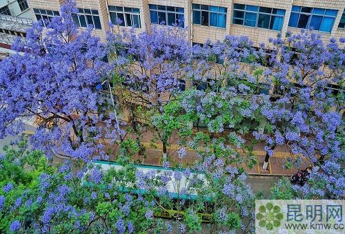 每年春夏之交的昆明,藍(lán)花楹是昆明街頭最美麗的花卉之一,錐狀紫色花序配上羽狀復(fù)葉,花雨飄落顯得浪漫十足,跟其花語“在絕望中等待愛情”一樣富有詩意。昆明最具特色的藍(lán)花楹景觀道,便是從學(xué)府路口順教場中路走,一直到二環(huán)北路入口一段約2公里的路段上。數(shù)百株藍(lán)花楹在這條道路上作為行道樹,長勢良好,樹的胸徑基本達(dá)20厘米,已形成一條全國聞名的藍(lán)花楹景觀林蔭大道。
